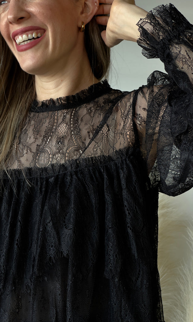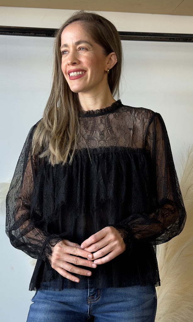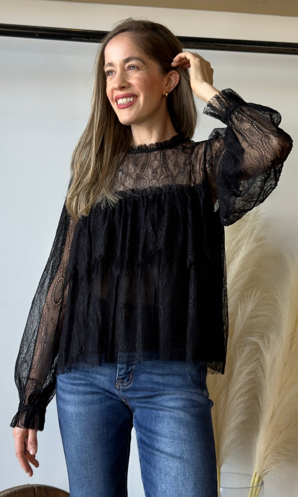 Ruffled Sheer Lace Long Sleeve Blouse