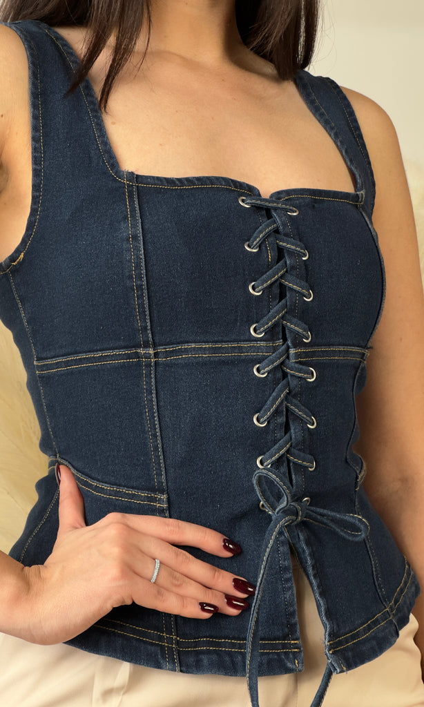 Lace Up Front Sleeveless Denim Top