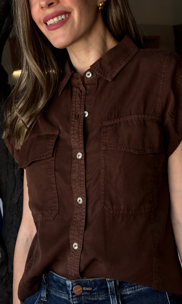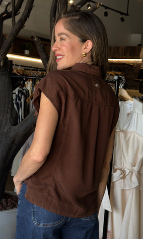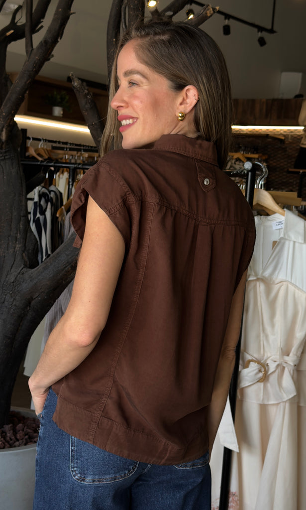 Tencel Sleeveless Collared Shirt- Full Button-Down Front, Two Chest Pockets, Spread V-Neck Collar - Model is Wearing Size Small - 100% TENCEL