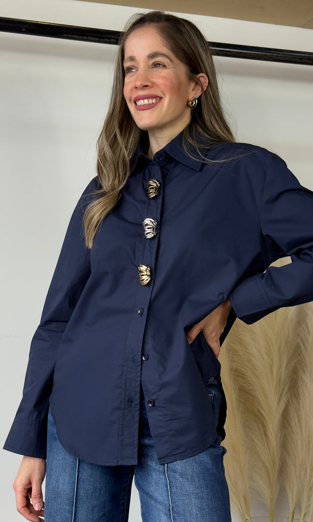 Navy Silver Button Blouse