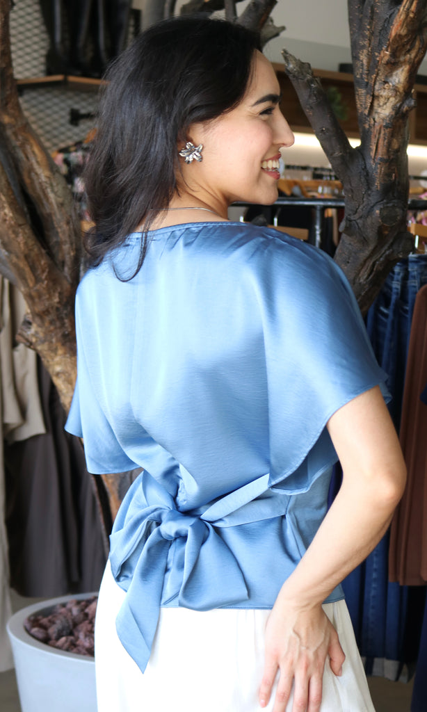 Boat Neckline Bell Sleeve Waist Tie Top